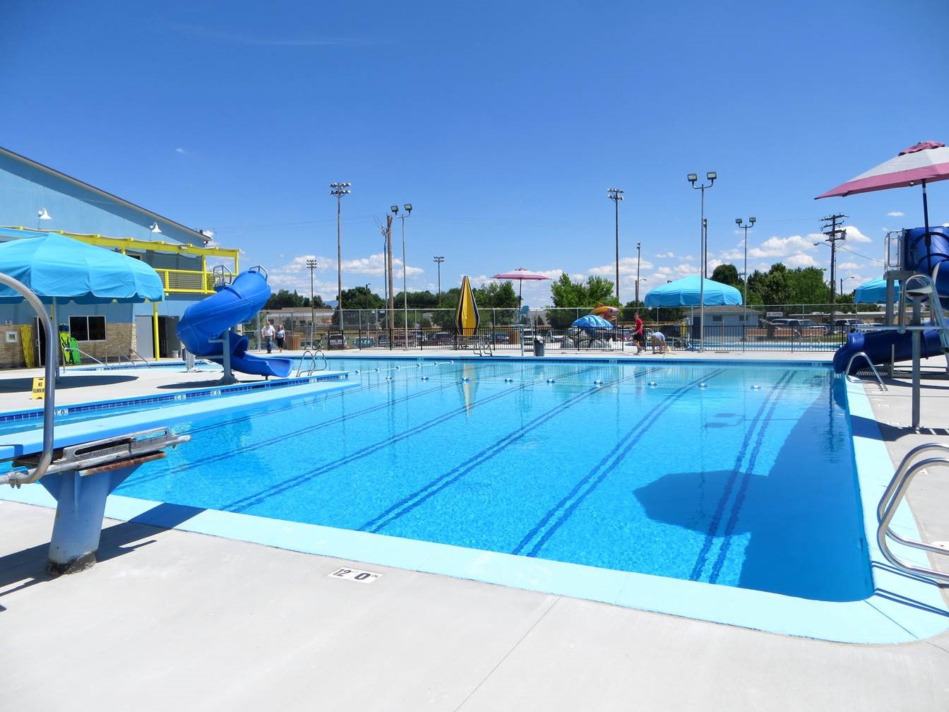 - Our Kiddie pool is an enclosed area that includes 1 slide with a splash mat, zero depth entrance with handrail assistance, and 3 large umbrellas for maximum shade for small children.